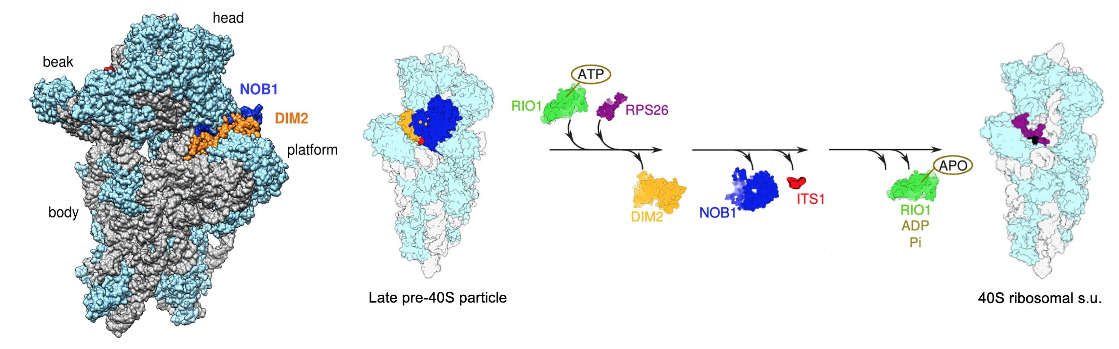 – Contrôle du clivage final de l’extrémité 3′ de l’ARNr 18S par l’endonucléase NOB1 dans le cytoplasme. La maturation de l’extrémité 3′ de l’ARNr 18S a lieu dans le cytoplasme et complète la formation des sous-unités 40S. En utilisant la microscopie cryo-électronique, nous avons résolu la structure des particules pré-40S humaines pendant les étapes tardives de la maturation. Des expériences menées in vitro et in cellulo nous ont permis de proposer que le clivage endonucléolytique par NOB1 sous le double contrôle du facteur de biogenèse des ribosomes RIOK1 et de la protéine ribosomale RPS26, la dernière protéine ribosomique intégrée dans cette sous-unité. (Thèse de doctorat de Laura Plassart ; Plassart et al. eLife 2022 ; collaboration : U. Kutay, ETH Zürich)