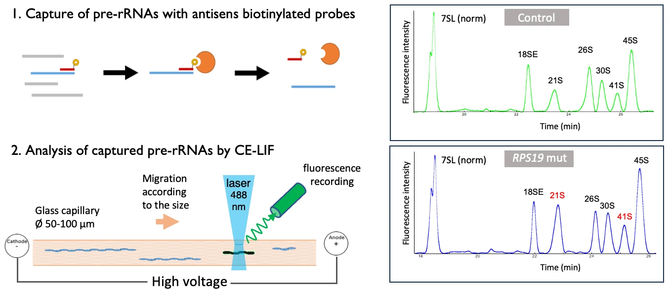 – Nouvelle méthode d’analyse des pré-ARNr par électrophorèse capillaire pour le diagnostic du DBAS. L’amélioration du diagnostic du DBAS est cruciale pour éviter l’errance diagnostique et fournir les soins adaptés aux patients. Nous avons mis au point un protocole utilisant l’électrophorèse capillaire couplée à la fluorescence induite par laser (CE-LIF) pour détecter les anomalies de maturation des pré-ARNr. Cette méthode a démontré une précision de plus de 85 % dans la distinction entre les patients atteints de DBAS et les individus non malades. Notre objectif actuel est d’automatiser et de standardiser cette approche par le biais d’une solution commerciale afin de la diffuser dans les laboratoires non spécialisés. Ce travail a été réalisé en étroite collaboration avec WinSep et Adelis, deux sociétés basées à Toulouse.
