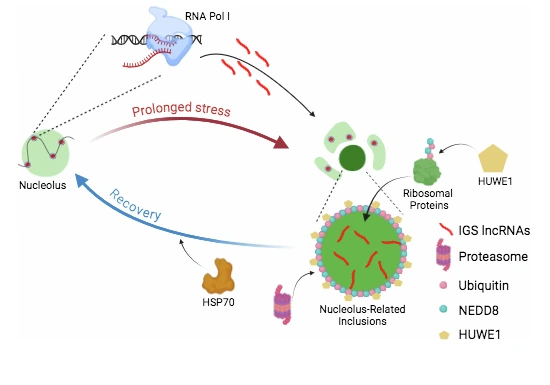 La plupart des étapes de la biogenèse des ribosomes chez les eucaryotes ont lieu dans le nucléole, un domaine nucléaire qui s’organise autour de l’ADN ribosomique (ADNr). Dans les cellules de mammifères, le nucléole adopte une structure tripartite qui reflète le mouvement centrifuge des pré-ribosomes de l’ADNr vers le complexe du pore nucléaire (CPN) au cours de leur maturation. L’auto-organisation du nucléole résulte de la condensation de ses composants, sous l’effet d’une part des interactions fonctionnelles protéine-protéine, protéine-ARN ou ARN-ARN liées à la biogenèse des ribosomes et d’autre part des interactions spontanées de domaines intrinsèquement désordonnés trouvés dans de nombreuses protéines nucléolaires, conduisant à une séparation de phase liquide-liquide. Sous certains stress, comme le choc thermique ou le stress protéotoxique, le nucléole se réorganise en même temps que s’interrompt la biogenèse des ribosomes et que se forment des agrégats de protéines contenant des protéines ribosomiques. Nous collaborons actuellement avec l’équipe de Dimitris Xirodimas (CRBM, Montpellier) pour comprendre les mécanismes conduisant au rétablissement du nucléole après un stress protéotoxique, en particulier le rôle des petits ARN non codants IGS dans ce processus. Nous avons réussi à observer les agrégats protéiques et leur disparition graduelle lors de l’atténuation du stress par microscopie à fluorescence à haute résolution et microscopie corrélative, en collaboration avec les plateaux de microscopie photonique et de microscopie électronique du CBI. L’élimination des agrégats implique les protéasomes nucléaires ainsi que le lncRNA IGS42, qui a été détecté dans les agrégats. Cette étude montre qu’un système de contrôle de la qualité des protéines opère dans le nucléole pendant la récupération du stress afin d’éliminer ces inclusions liées au stress (Brunello et al., EMBO J. 2025).