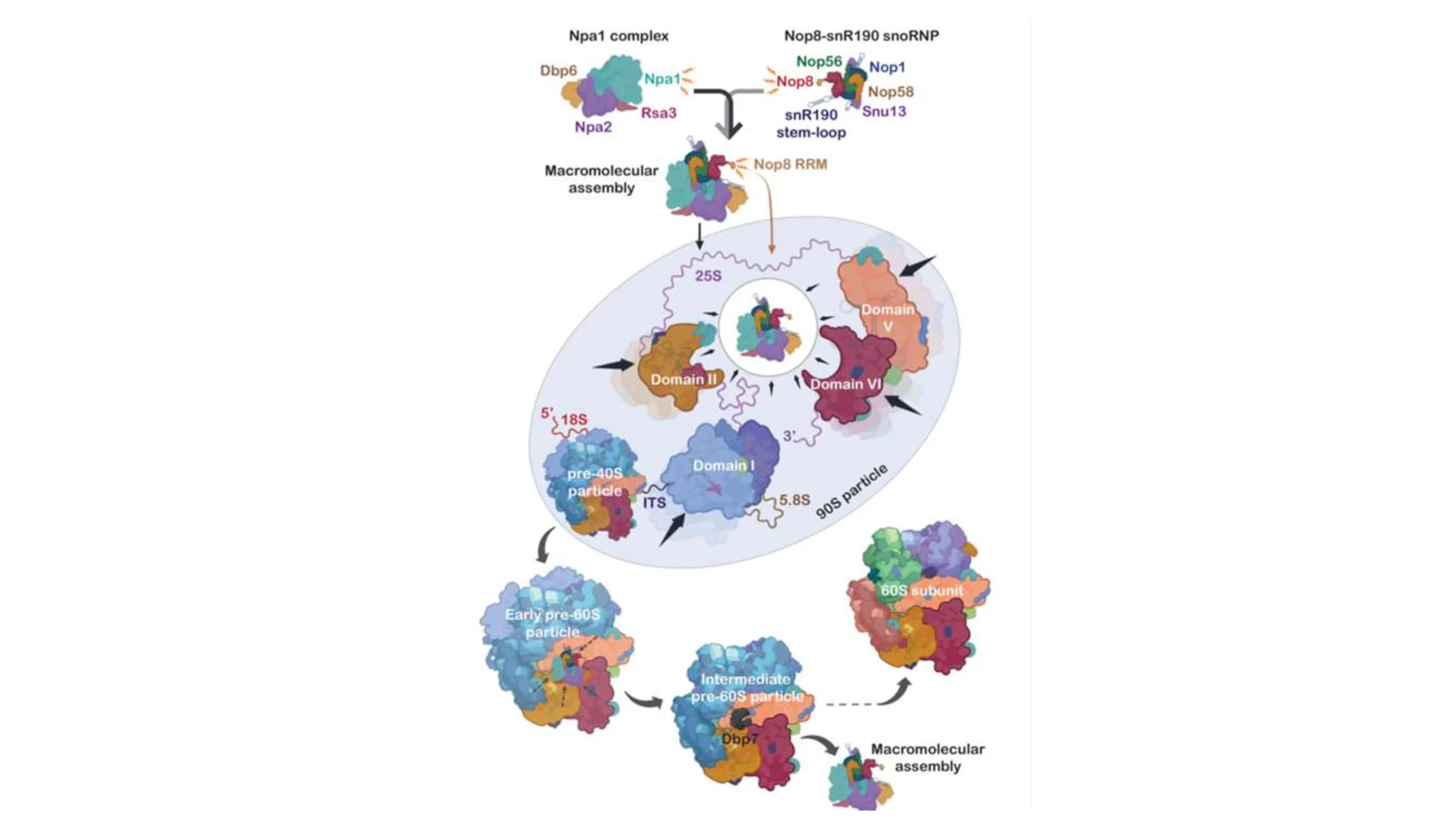 Un grand nombre de facteurs d’assemblage des ribosomes (FA) jouent un rôle central dans l’assemblage et la maturation des particules précurseurs. Ces étapes d’assemblage et de maturation comprennent le repliement progressif des ARNr et l’incorporation des protéines ribosomiques pour donner les sous-unités ribosomiques matures.