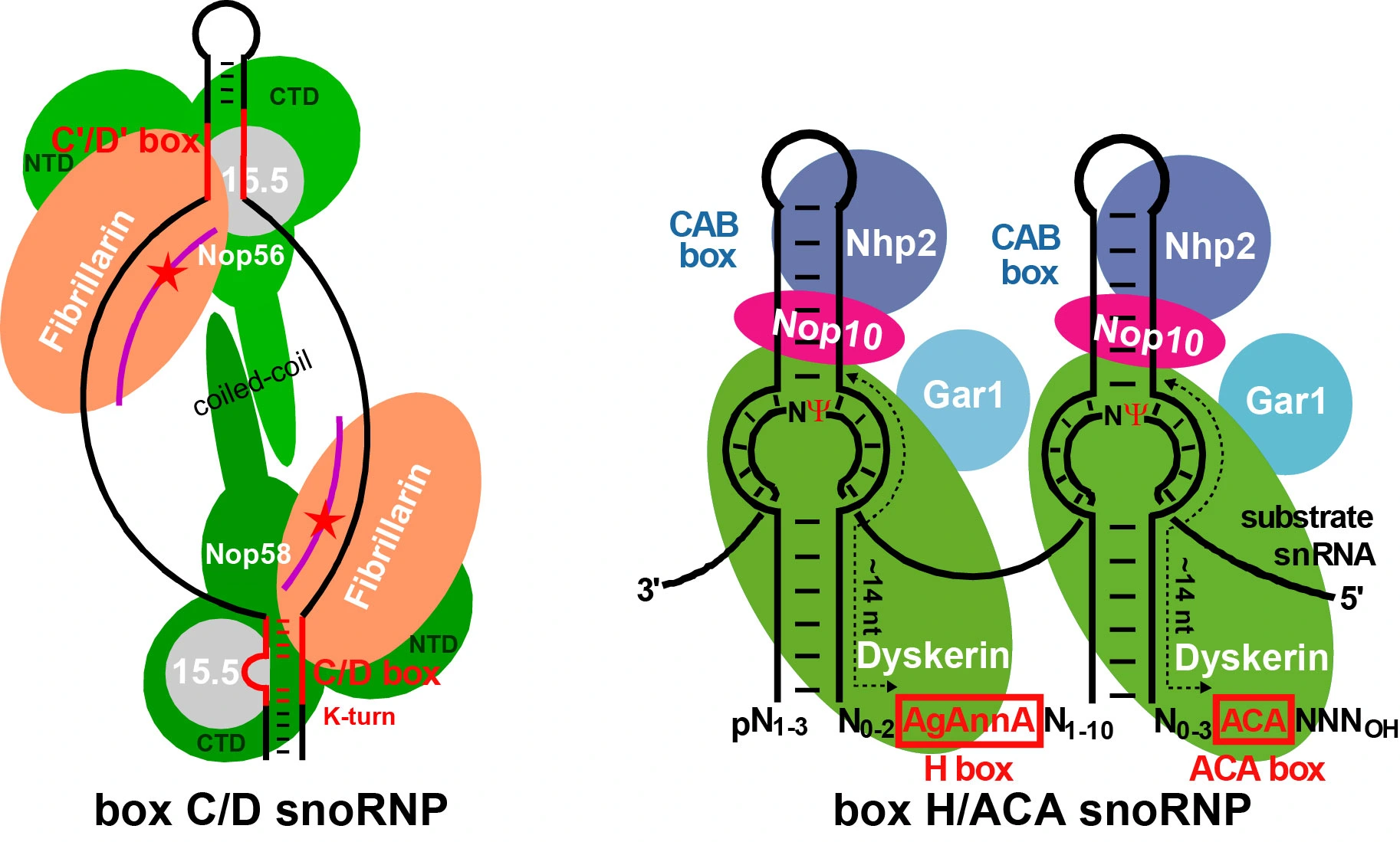 La méthylation du 2′-O-ribose et la pseudouridylation des ARN ribosomiques (ARNr) et des snRNA spliceosomaux sont dirigées par des RNP guides à boîte C/D (2′-O-méthylation) et à boîte H/ACA (pseudouridylation). Chaque RNP guide est composée d’un ARN guide spécifique et d’un ensemble de protéines communes aux C/D ou H/ACA, dont la fibrillarine (méthyltransférase) et la dyskérine (pseudouridine synthase). Les RNP guides fonctionnent par la formation d’interactions transitoires par appariement de bases avec leurs ARN cibles. Cette interaction positionne le nucléotide substrat au niveau du centre catalytique de l’enzyme de modification associée à l’ARN guide. Cependant, certains ARN à boîtes C/D et H/ACA n’ont pas la capacité d’appariement de bases pour sélectionner des séquences d’ARNr ou de snARN pour la 2′-O-méthylation et la pseudouridylation. La fonction de ces ARN guides dits « orphelins » reste inconnue. Actuellement, nous utilisons des techniques de crosslink ARN-ARN in vivo pour identifier les ARN cibles des ARN guides orphelins. Auparavant, nous avons démontré que certains ARN guides à boîtes H/ACA sont capables de former des interactions alternatives et dynamiques avec leurs séquences cibles afin de positionner deux uridines différentes pour la pseudo-uridylation. Nous étudions actuellement si les « acrobaties de l’ARN guide » pourraient également contribuer à la 2′-O-méthylation des ARNr et snARN humains dirigée par les ARN à boîte C/D.