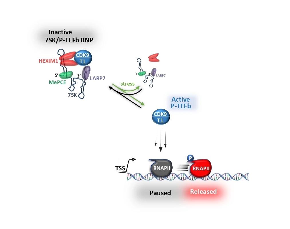 La pause transcriptionnelle est une étape clé dans la régulation de la transcription par l’ARN polymérase II (ARNPII). La transition vers une élongation productive repose sur le facteur positif d’élongation de la transcription (P-TEFb), une kinase qui favorise la synthèse des ARN messagers en libérant l’ARN polymérase II en pause dans le corps des gènes. L’activité de P-TEFb est principalement contrôlée par l’ARN 7SK qui, en collaboration avec les protéines MePCE, LARP7 et HEXIM1, séquestre P-TEFb au sein d’une RNP 7SK/P-TEFb catalytiquement inactive. La RNP 7SK contrôle la disponibilité de P-TEFb en libérant ou en capturant du P-TEFb actif en fonction des besoins transcriptionnels de la cellule, ce qui en fait potentiellement l’un des moyens les plus efficaces de contrôler la pause de l’ARNPII dans les cellules humaines. Par exemple, P-TEFb est rapidement dissocié de la RNP 7SK en réponse au stress, ce qui entraîne la libération de l’ARNPII en pause sur tout le génome et permet une reprogrammation de la transcription. Ainsi, la RNP 7SK peut contrôler le « timing » de transitions transcriptionnelles clés, non seulement pendant la réponse au stress, mais aussi au cours du développement et pendant la tumorigenèse. En effet, l’altération de la liaison de la RNP 7SK à P-TEFb entraîne la transformation des cellules en culture et a été associée à divers cancers, à l’hypertrophie cardiaque, à des troubles du développement neurologique, ainsi qu’à des maladies inflammatoires et auto-immunes. Comprendre comment la RNP 7SK régule la transcription par l’ARNPII dans divers contextes physiologiques et pathologiques est un objectif majeur de notre travail.