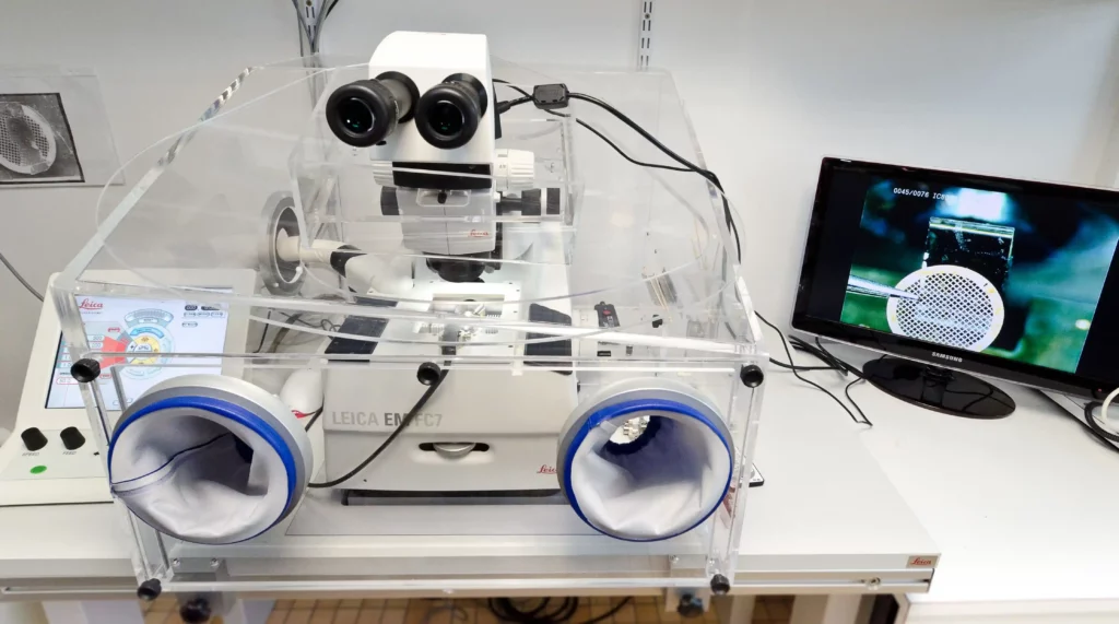 Cryofixateur haute pression pour congeler les échantillons dans de la glace vitreuse. Cela permet d’améliorer la qualité morphologique, de permettre de saisir des évènements biologiques de courte durée et d’améliorer la préservation des antigènes qui sont souvent sensibles aux fixateurs chimiques.