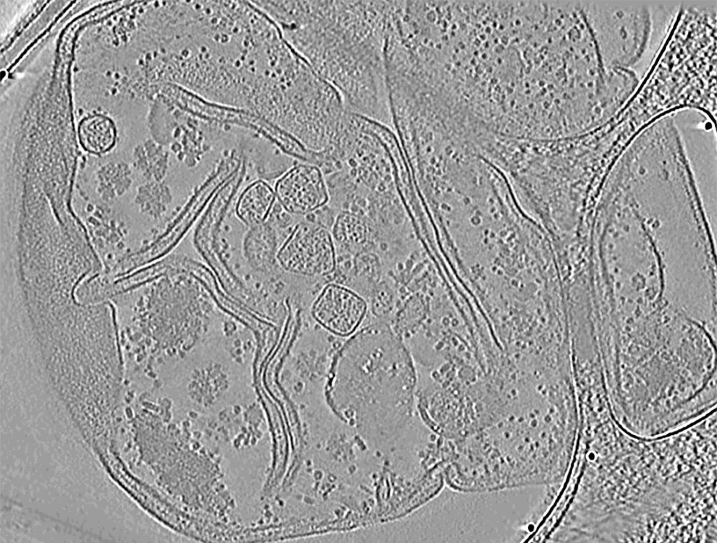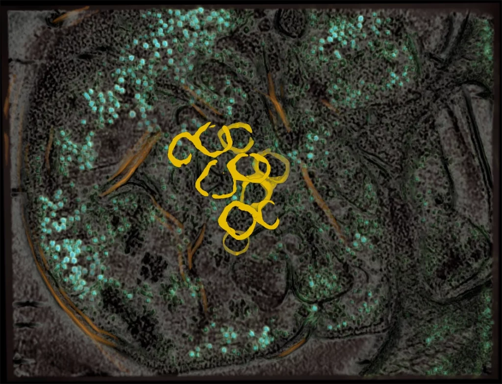 Segmentation : Identification et isolation des régions d’intérêt dans les volumes tomographiques 3D, permettant une analyse détaillée des composants cellulaires et des complexes moléculaires.