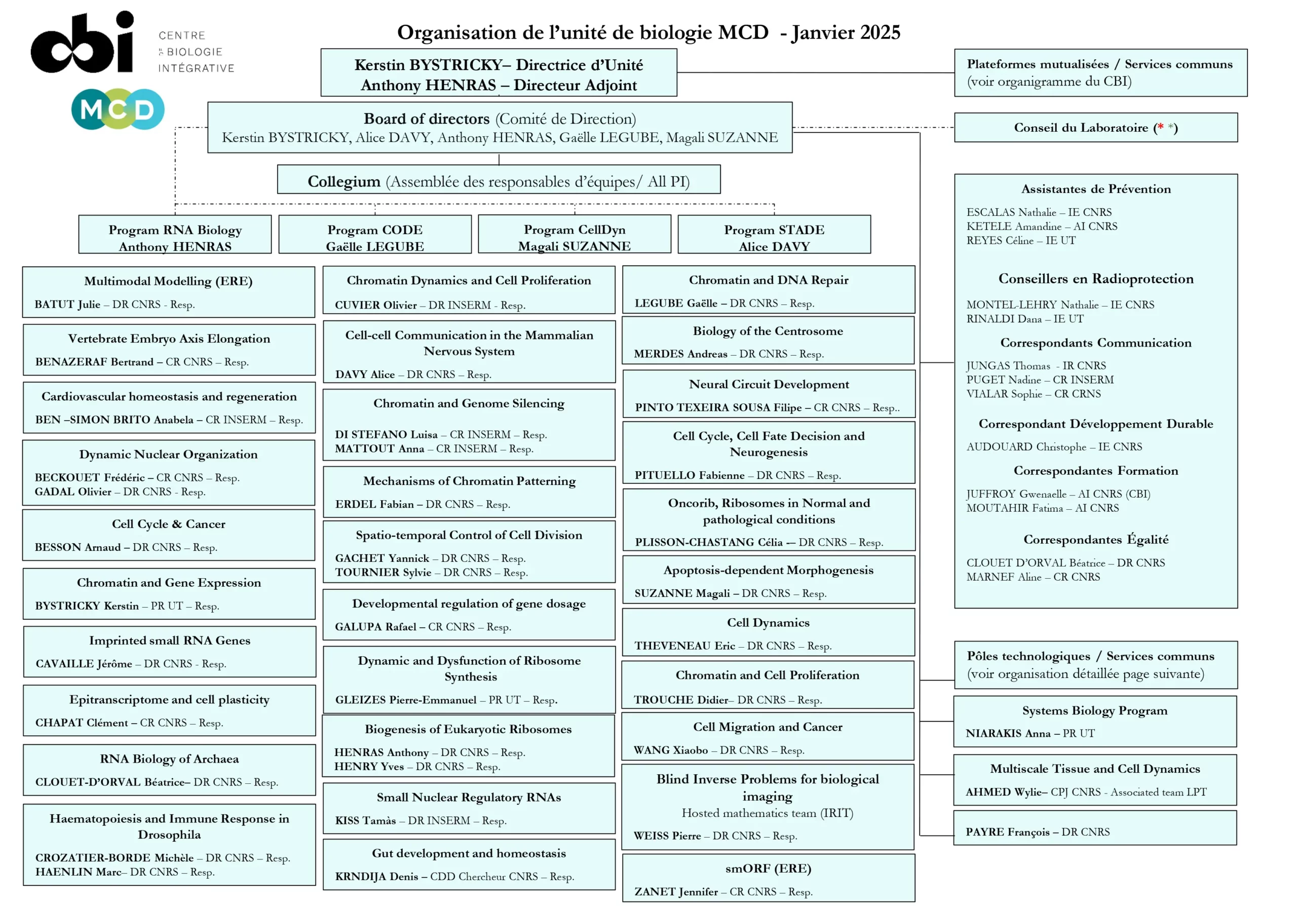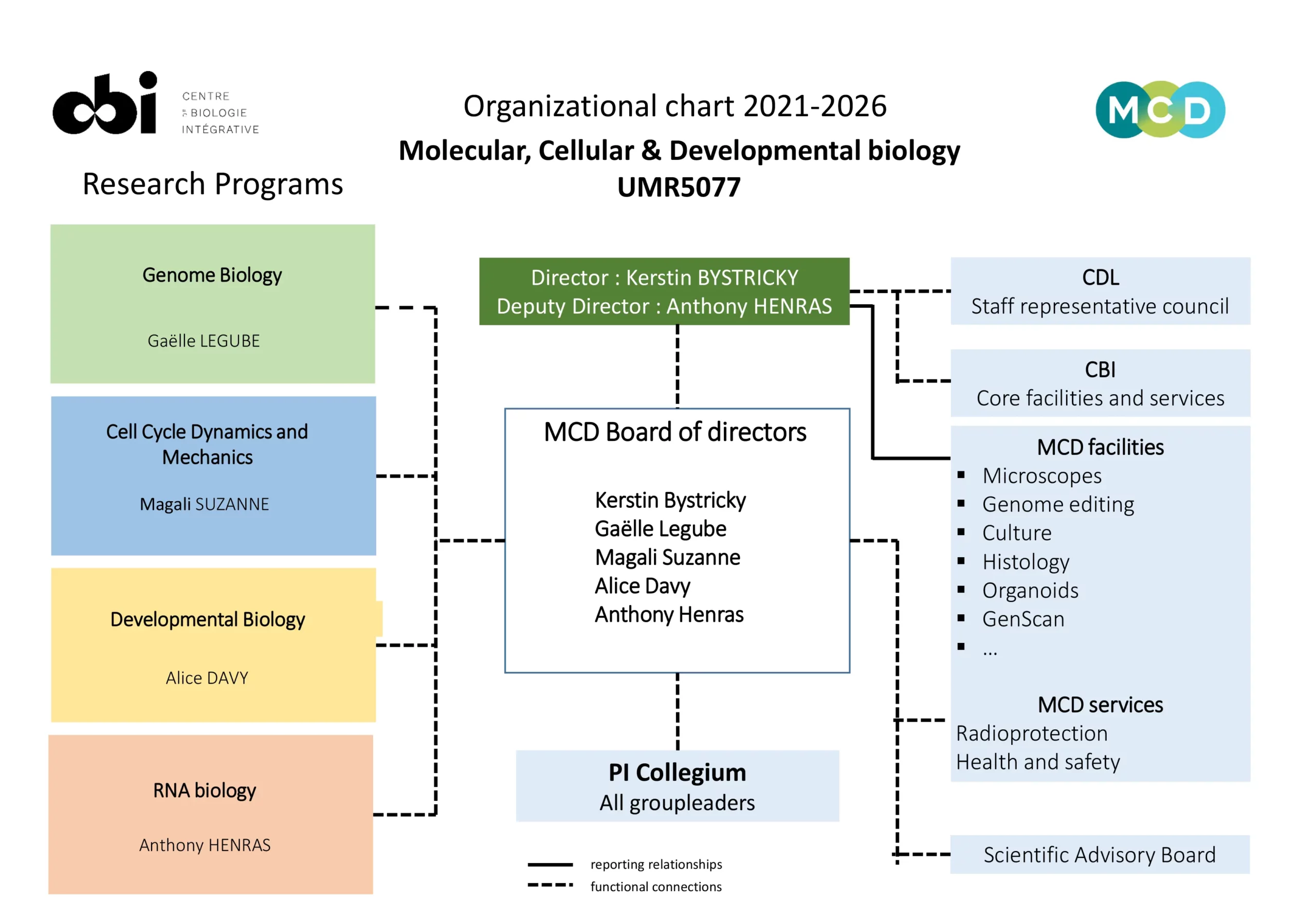 L’activité de recherche de l’unité MCD est dédiée à la recherche fondamentale en sciences de la vie, orientée sur les mécanismes régissant l’organisation et la fonction des génomes, la division et la mécanique cellulaire, l’identité cellulaire et le développement. Elle est abordée à des échelles allant des molécules simples et des machines macromoléculaires aux tissus/organes et organismes entiers. L’unité MCD comprend 26 équipes structurant l’activité de plus de 200 personnes au sein de 4 programmes de recherche. Le Centre de Biologie Intégrative (CBI) est une fédération qui regroupe les unités MCD, LMGM et CRCA, unités de recherche mixte entre l’Université de Toulouse.