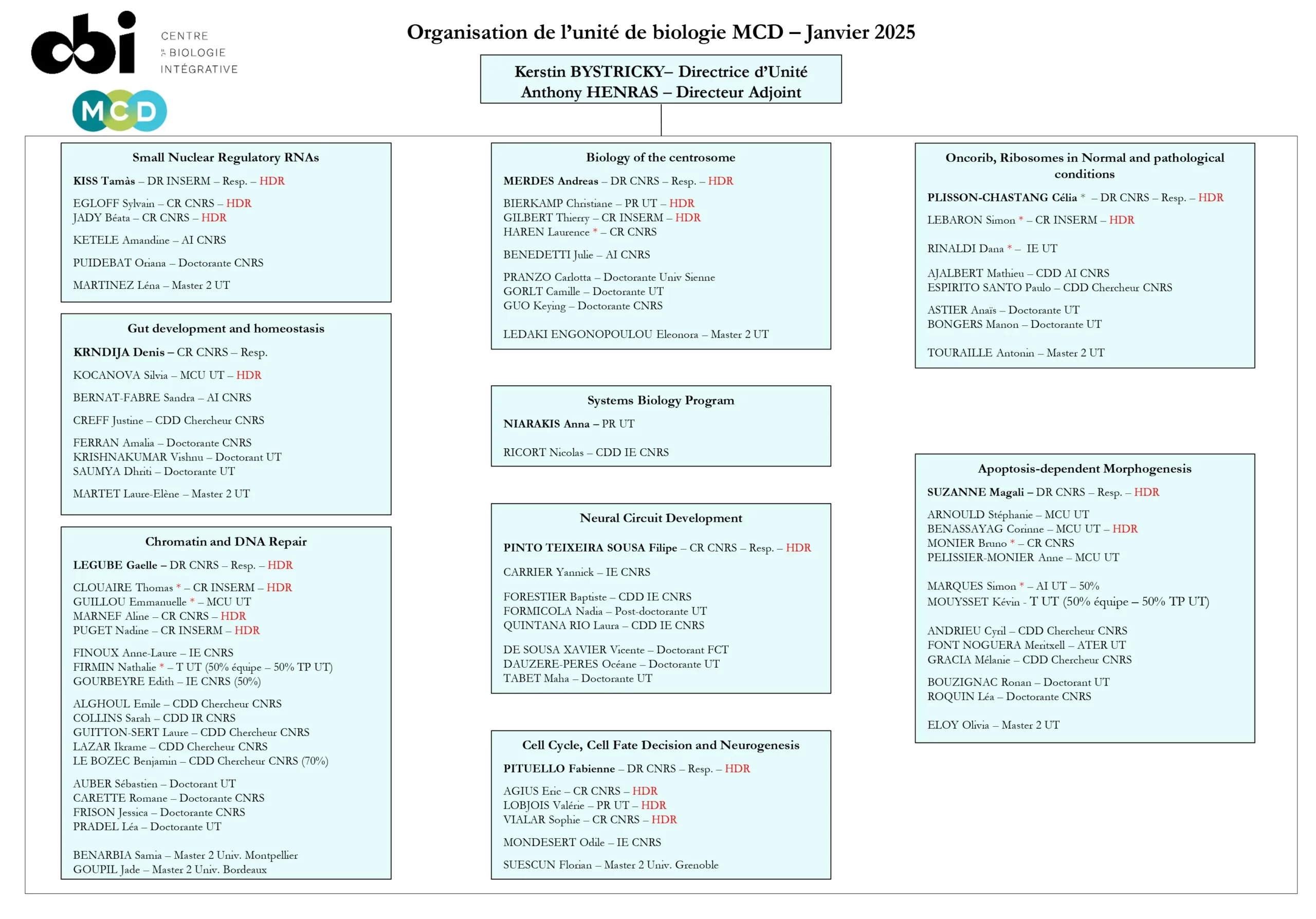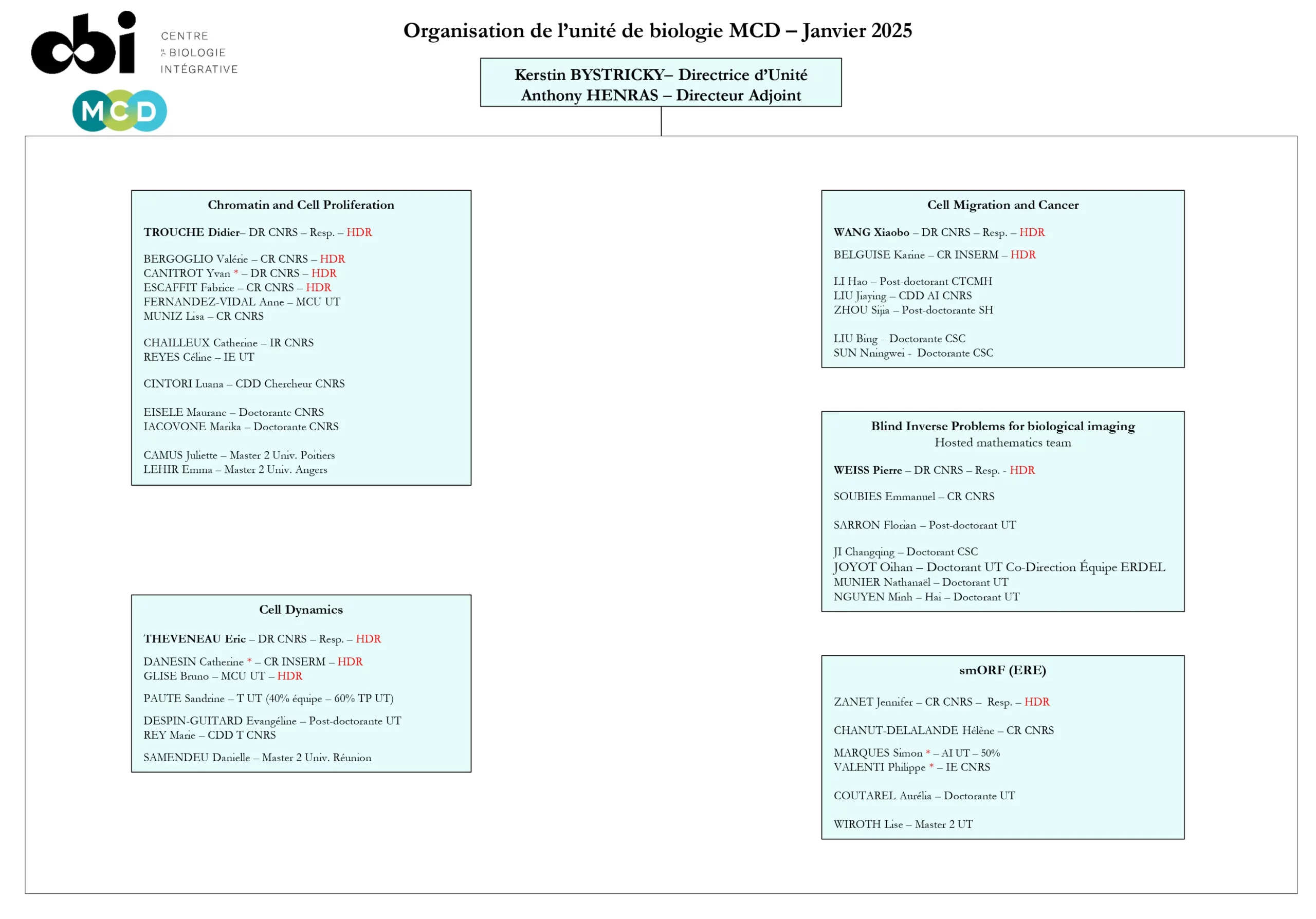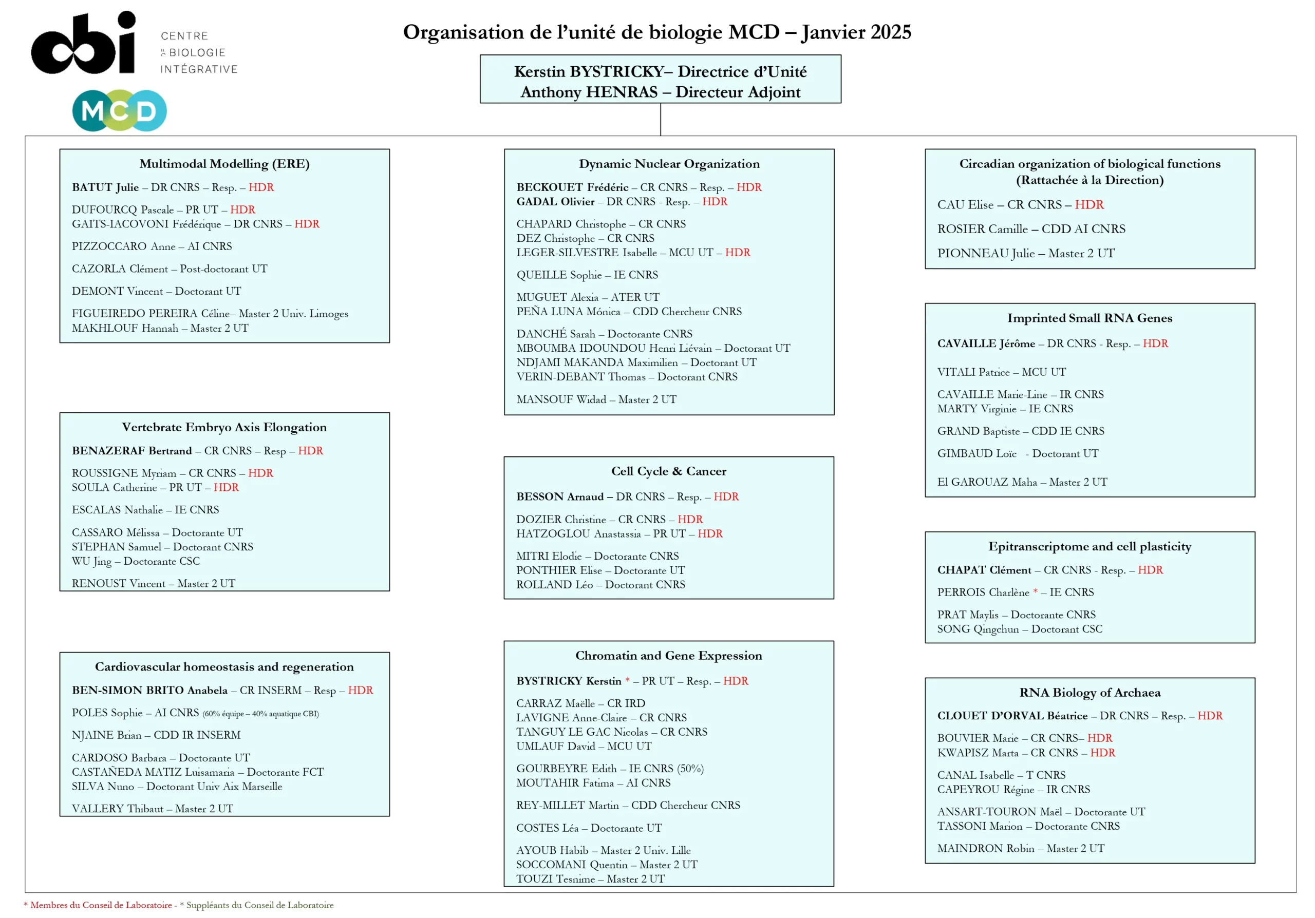 est responsable d’équipe au CBI et représente la communauté CODE (« Chromosome Organization, Dynamics and Evolution ») au conseil d’administration de l’unité MCD.